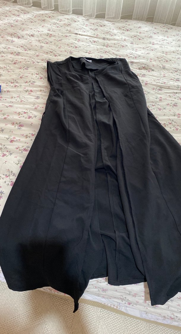 Siyah, drapeli tasarıma sahip uzun kadın kumaş pantolon. Sentetik kumaştan, bol kesim ve günlük kullanım için uygundur. Gotik tarzda.