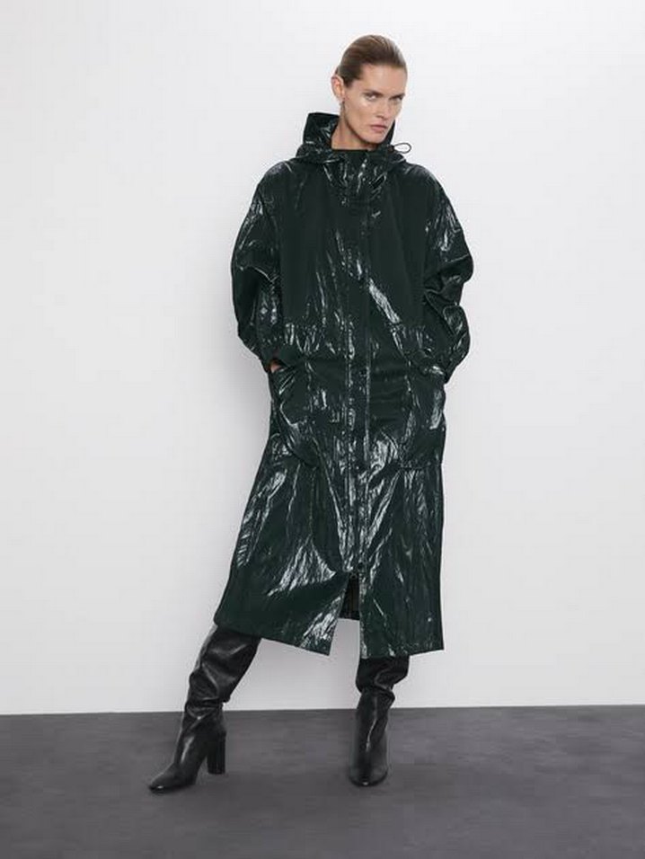 Drapeli Siyah Uzun Kadın Yağmurluk
