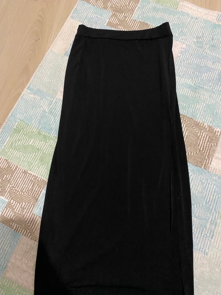 Sentetik kumaştan yapılmış, drapeli ve vücuda oturan siyah uzun etek, yırtmaçlı