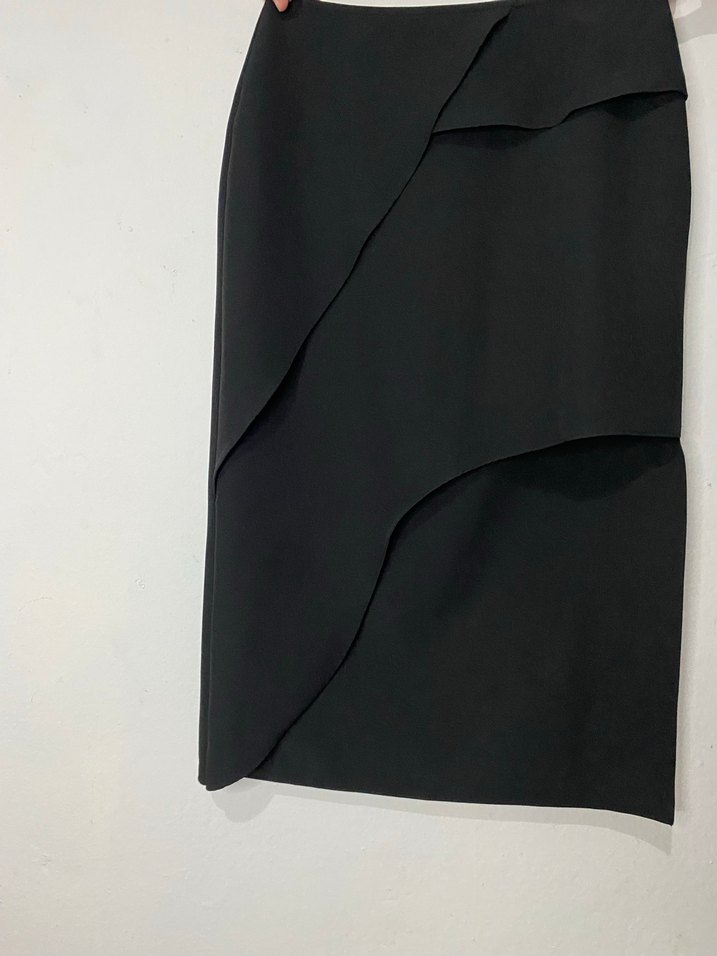 Siyah uzun kalem etek, drapeli tasarımı ve regular kesimiyle ofis için uygun, yumuşak sentetik kumaştan üretilmiştir.