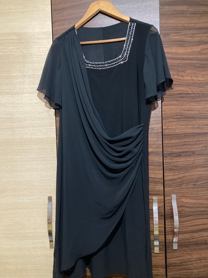 Drapeli ve kısa kollu siyah uzun elbise, kare yaka ve zarif süslemelere sahip. Temiz kullanıldı