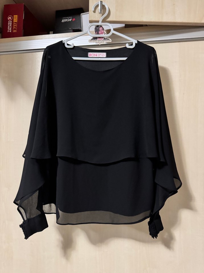 Siyah, drapeli uzun kollu ve bol kesim bluz. İpek dokulu kumaştan, midi boyda ve desensiz, günlük kullanım için uygun.