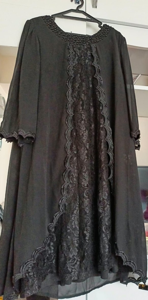 46 beden ve bol kesim bir model; içinde çok rahat hareket ediliyor, hiç kasmıyor. Önündeki danteli ve yakasındaki boncukları gayet zarif, ne çok sade ne de çok abartı duruyor. Şifon kumaşı dökümlü ve kaliteli.Sadece [1-2] kez giyildi, hiçbir sorunu veya hatası yok. Alacak olan kişi gönül rahatlığıyla giyebilir. Şimdiden hayırlı olsun."