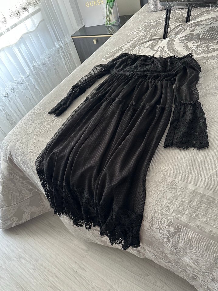 Siyah uzun kollu, dantel detaylı, drapeli ve desenli gotik elbise. Salaş kesimi ve kayık yaka ile günlük kullanıma uygundur.