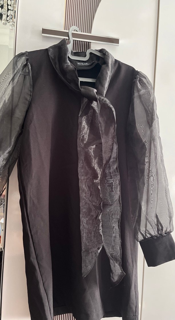 Siyah renkte, drapeli ve yüksek yakalı uzun elbise. Yumuşak sentetik kumaştan, bol kesim ve şeffaf uzun kollu, günlük giyime uygun gotik tarzda.