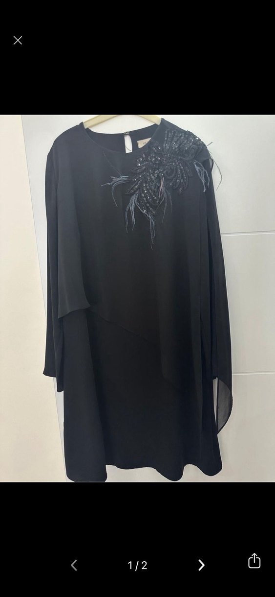 Siyah uzun kollu, drapeli ve bol kesim gotik elbise. Yuvarlak yaka ve omuzda baskılı detaylara sahip, düğün için uygun.