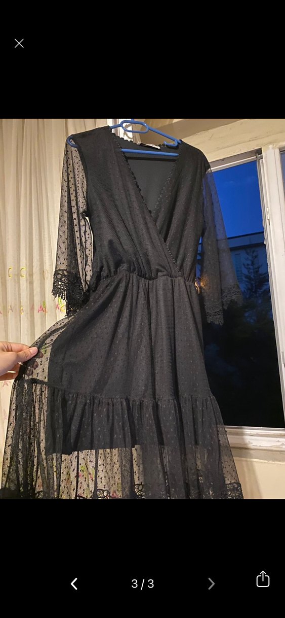 Bu siyah uzun elbise, drapeli ve V yakalıdır. Uzun kollu, işlemeli ve yumuşak sentetik kumaştan yapılmıştır. Gotik tarzda, romantik akşamlar için uygundur.