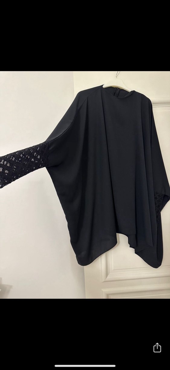 Siyah hamile bluzu, yüksek yaka ve uzun kollu, drapeli, bol kesim. Sentetik kumaştan, mütevazı gotik stile uygun, günlük kullanım için.