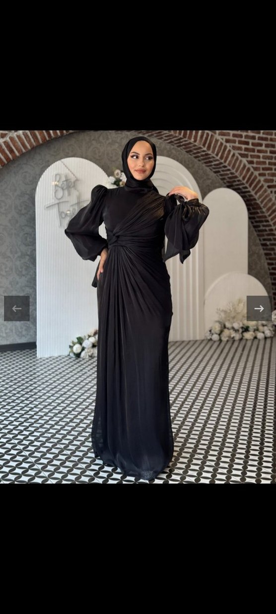 Yüksek yakalı, uzun kollu, drapeli ve hafif batik desenli siyah uzun abiye elbise, mütevazı gotik tarzda düğünler için uygundur. 44 beden 1 defa giyildi sorunsuz