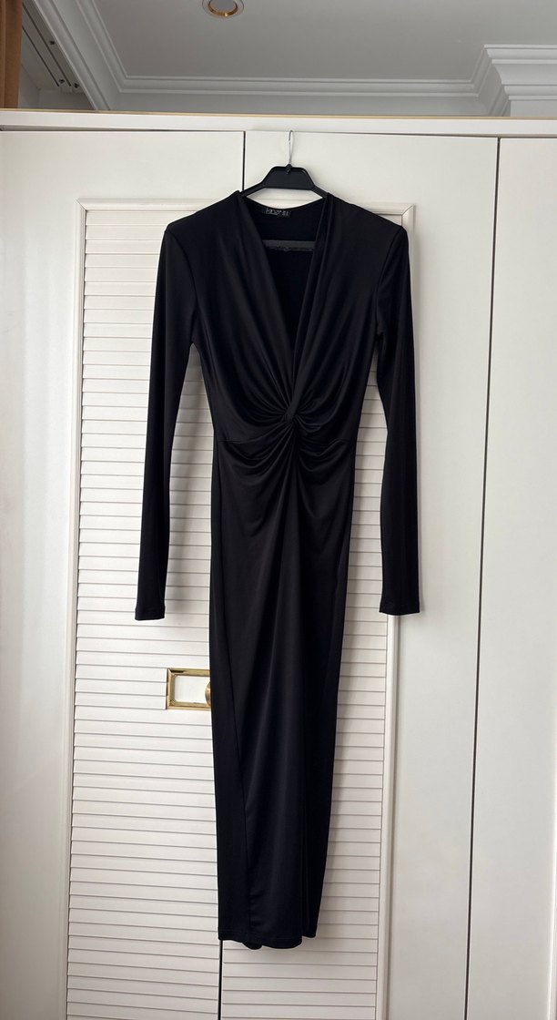Drapeli ve V yakalı, uzun kollu siyah elbise, ince oturan kesimiyle modern klasik stil sunar. Ofis için uygun, sentetik kumaştan yapılmıştır.