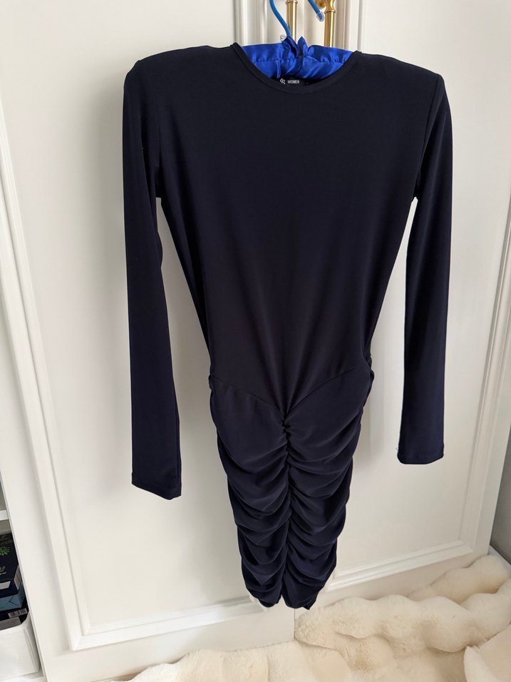 Dar kesim siyah gece elbisesi, uzun kollu ve bisiklet yaka. Etek kısmında drapeli detay bulunur. Minimalist ve gotik tarzda, romantik buluşmalar için uygun.