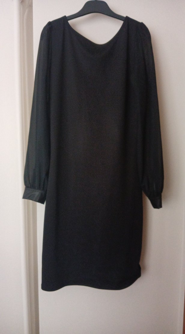 Siyah uzun kollu kadın elbisesi, drapeli. Yuvarlak yakalı ve desen içermeyen bu elbise, minimalist gotik tarzıyla ofis kullanımı için uygundur. sol kol kısmında ufak bir ip kaçması var