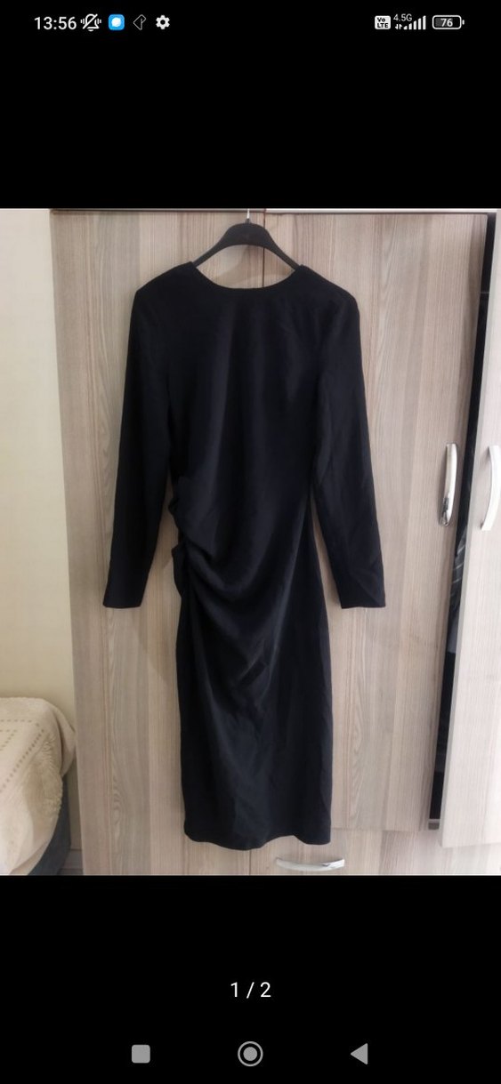 Bu siyah, uzun kollu ve drapeli elbise, ince kesimi ve yuvarlak yakasıyla ofis için uygun minimalist, şık bir görünüm sunar.