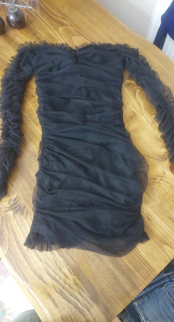 Drapeli Siyah Uzun Kollu Midi Kadın Elbise