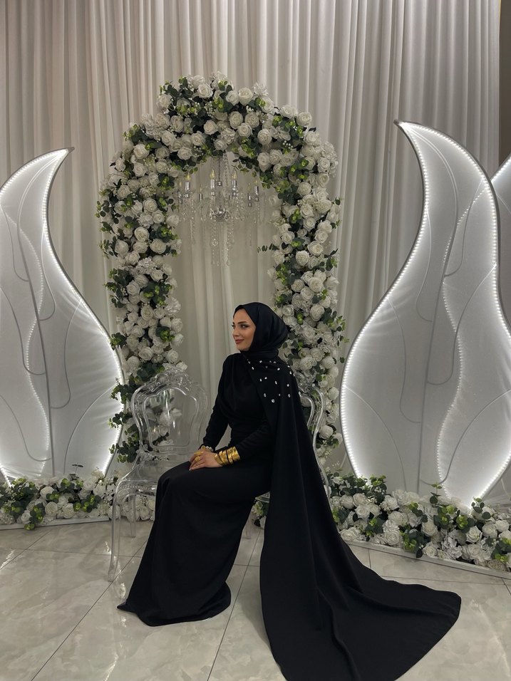 Ürün yalnızca 1 kez giyildi.. Drapeli, uzun kollu, yüksek yakalı siyah abiye. Yakada ve bel de ve tek omuzda gümüş taş detayı vardır. Nakış detayları ve gotik tarzıyla düğünler (nişan kına )için uygun, vücuda oturan kesim.
