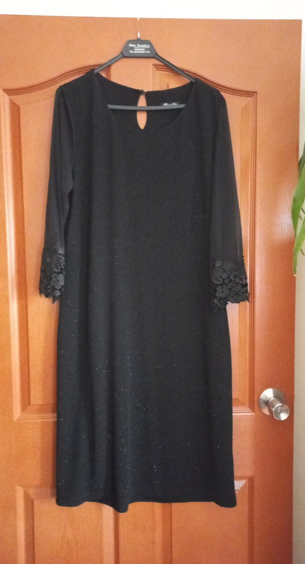 Siyah uzun kollu, drapeli ve çiçek detaylı kolları olan, salaş kesim uzun elbise. Önü yuvarlak yaka, arkada anahtarlık kapanışı bulunur. Ofis kullanımı için uygun. etiketinde 4xl yazıyor iki kol arasi 52 cm boy 105 cm