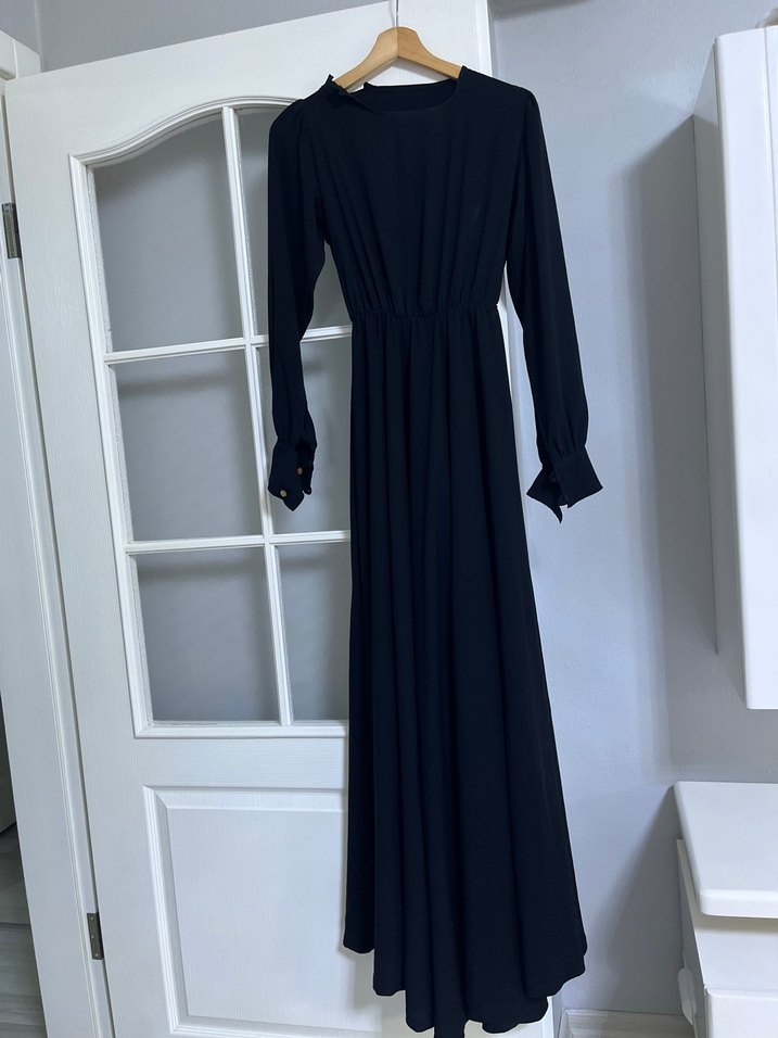 Drapeli, uzun kollu siyah uzun elbise, yüksek yakalı ve bol kesimdir. Pürüzsüz sentetik kumaştan yapılmıştır, minimalist gotik tarzı ve ofis kullanımı için uygundur.