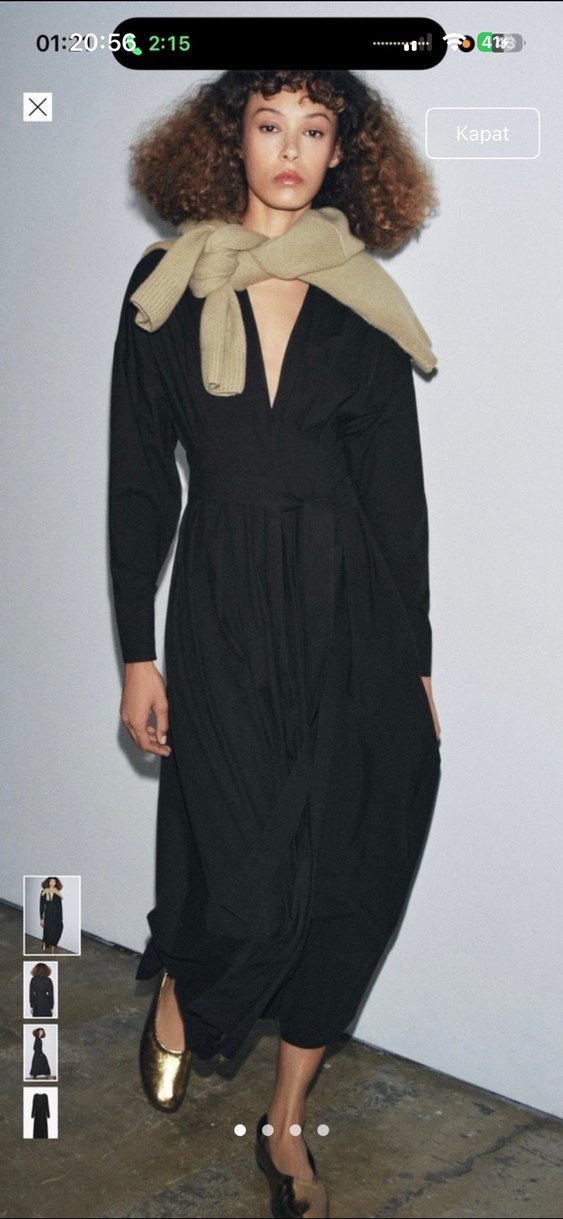 Siyah uzun kollu ve V yakalı bu uzun elbise, drapeli tasarımı ve bol kesimiyle dikkat çekiyor. Yumuşak ve sıcak dokusuyla günlük kullanıma uygundur.