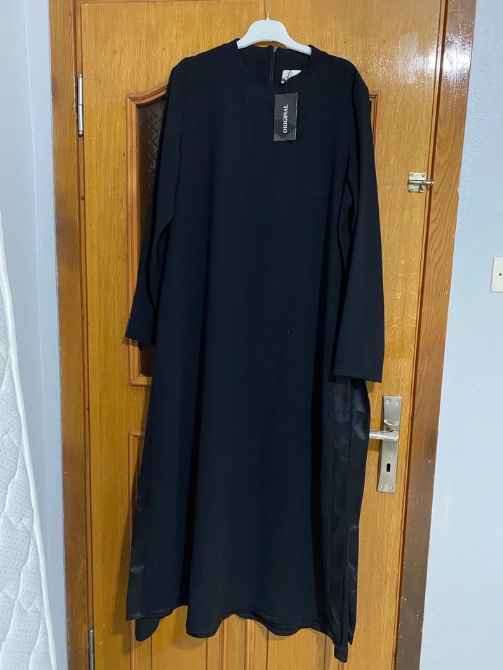 Bu siyah uzun elbise, uzun kollu ve yuvarlak yakalıdır. drapeli ve sade normcore tarzındadır, özel günler için uygundur.