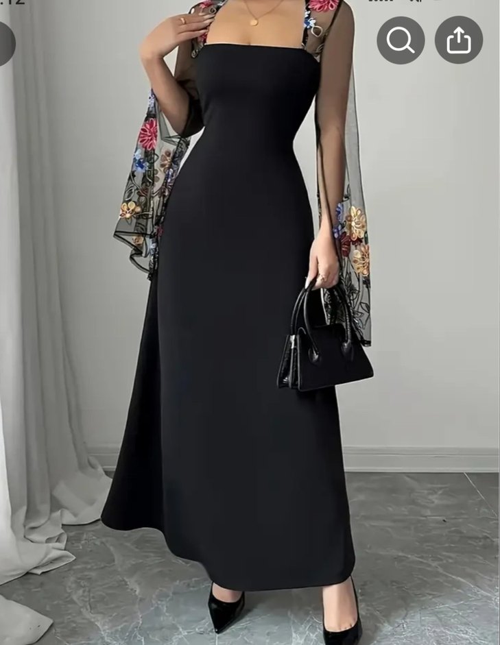 Siyah uzun elbise, straplez yaka ve ince askılı kollara sahiptir. Nakış detayları ve drapeli tasarımı ile düğünler için uygundur. Sentetik kumaştan, regular fit.
