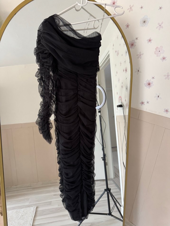 Fitted kesim siyah abiye elbise, straplez yakalı ve askılı kollu, drapeli ve büzgülü tasarıma sahip, avant-garde parti tarzı için uygun. 1 kere giyildi deformesi yoktur Xs s bedene uygundur