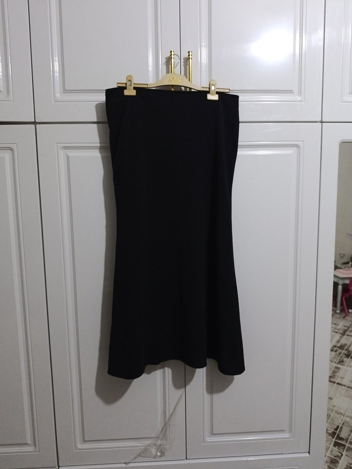 Drapeli tasarıma sahip, siyah süet uzun ve dar kesim etek. Ofis için minimalist gotik tarzına uygun.