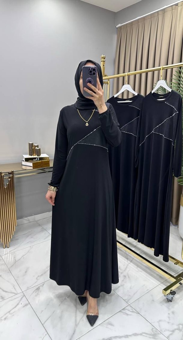 Siyah uzun elbise, bol kesim ve drapeli tasarıma sahip. Sentetik kumaştan üretilmiş, yüksek yakalı, sade ve günlük kullanıma uygun.50/52 beden