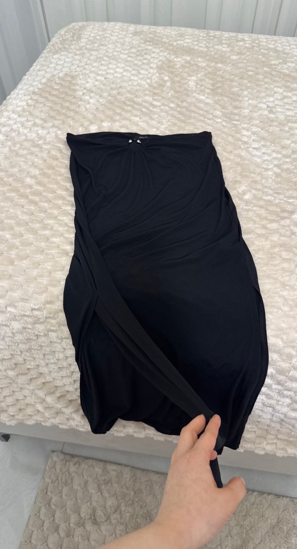 Siyah, sentetik kumaştan, drapeli ve uzun kesim, vücuda oturan günlük kullanıma uygun goth tarzda.