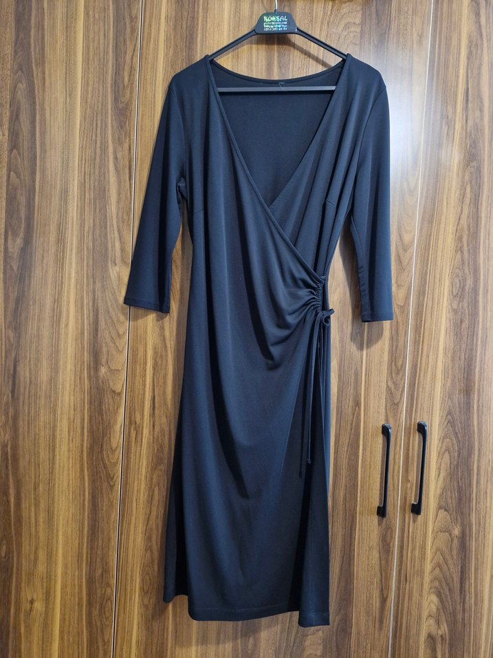 V yaka ve yan drapeli, siyah uzun elbise, minimalist ve klasik şıklığı bir araya getirir. Özel dikimdir 60/70 kılo arası cok rahat kullanır