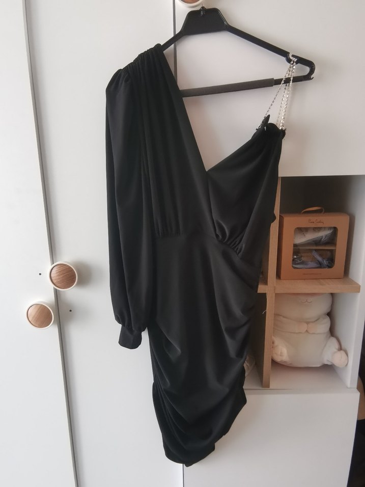 Drapeli Siyah Uzun V Yakalı Strappy Elbise
