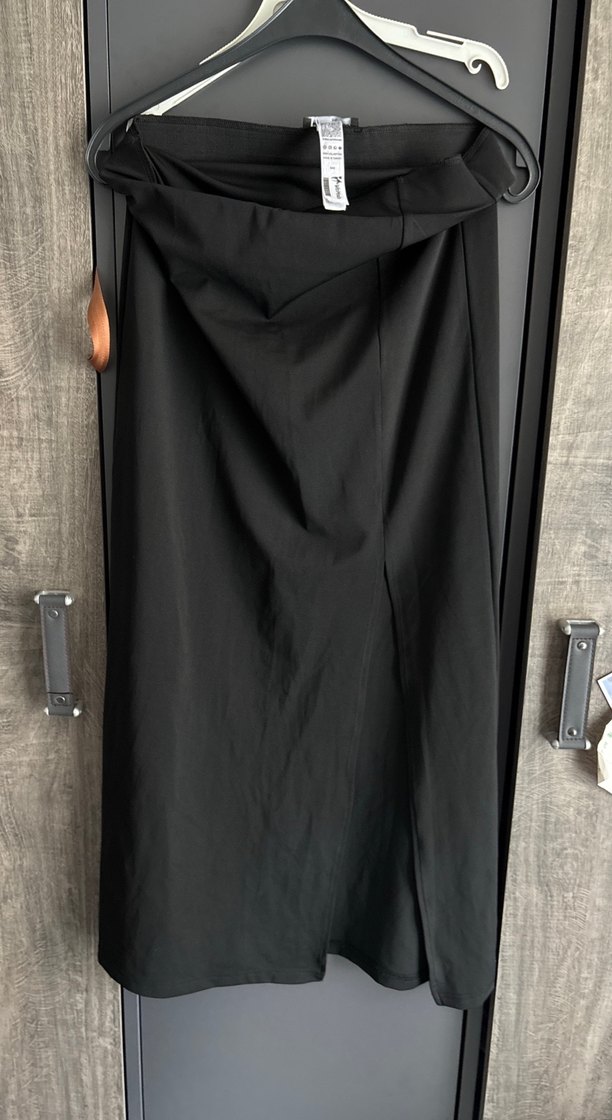 Drapeli tasarıma sahip, sentetik kumaştan yapılmış siyah uzun ve dar kesim etek, ofis için minimalist ve şık bir tercih.büyük beden yırtmaçlı etek