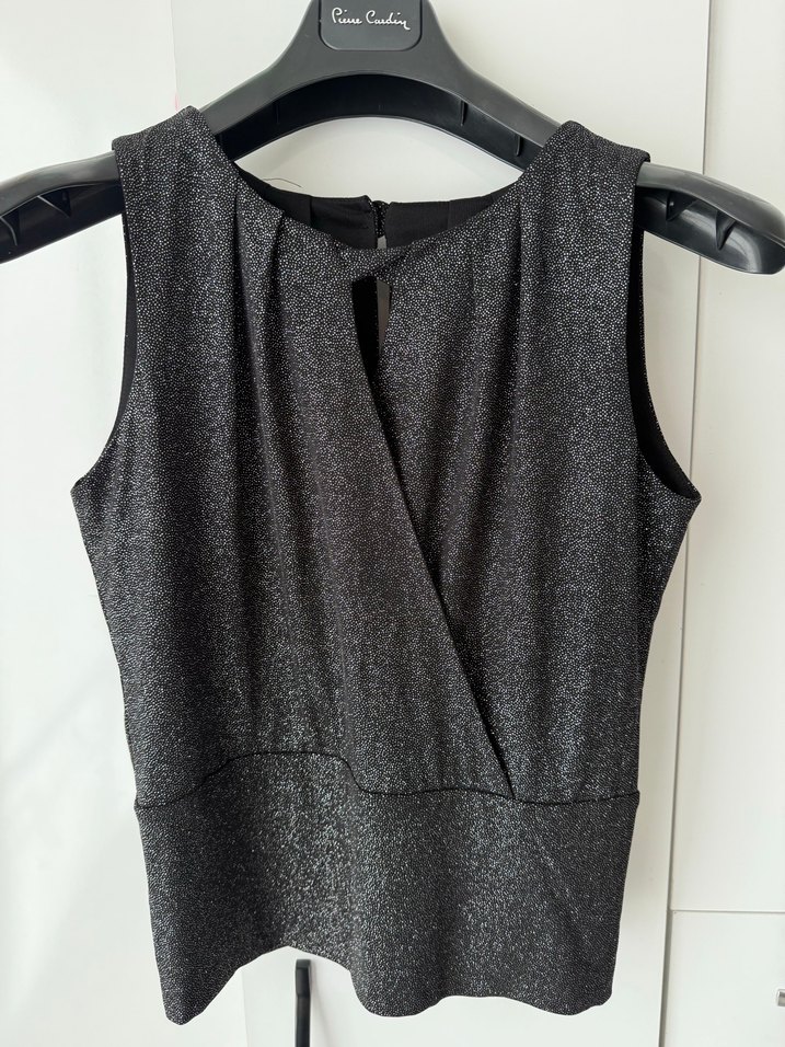 V yaka, kolsuz, drapeli tasarıma sahip siyah parıltılı bluz Sentetik kumaştan üretilmiş, ofis için şık ve çağdaş tarzda.