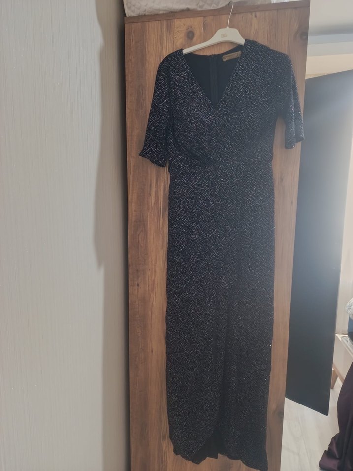 Drapeli Siyah V Yaka Uzun Kadın Elbise