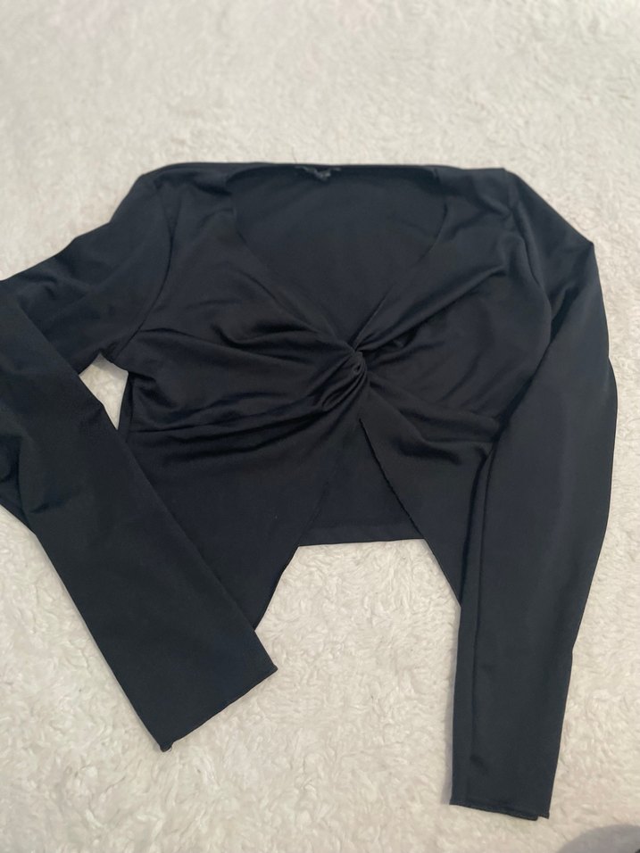 Drapeli tasarıma sahip, V yaka ve uzun kollu siyah bluz, yumuşak sentetik kumaştan, ofis için uygun.