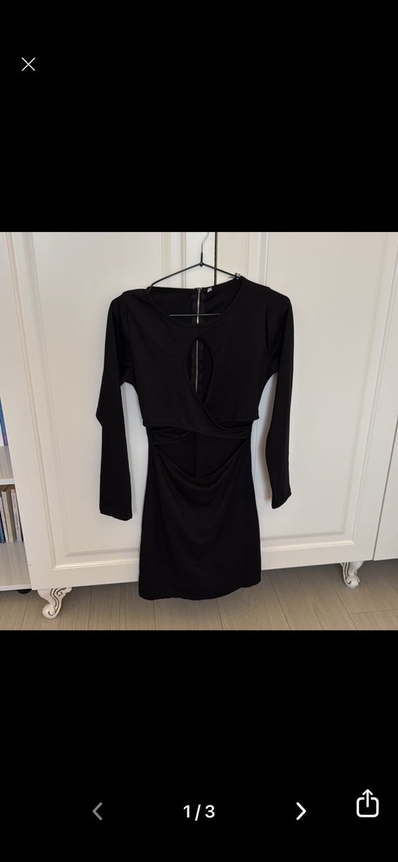 Drapeli detaylı, V yaka ve uzun kollu siyah midi elbise. Minimalist gotik tarzıyla romantik akşamlar için uygundur.