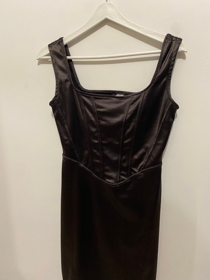 Drapeli ve V yakalı, askılı siyah gotik tarzda, normal uzunlukta, vücuda oturan kadın gece elbisesi.