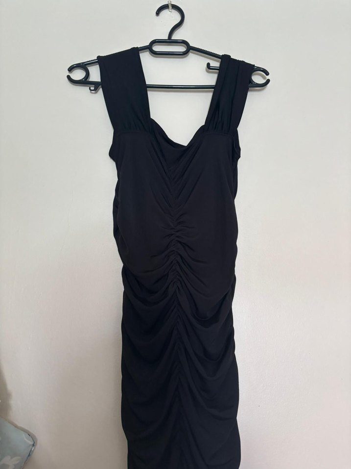 V yakalı, kolsuz, drapeli siyah midi elbise, minimal romantik akşamlar için uygun.