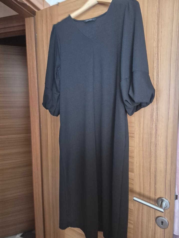 Siyah uzun elbise, V yakalı, drapeli uzun kollu ve bol kesimdir. Minimalist ve şık, ofis ortamına uygundur.