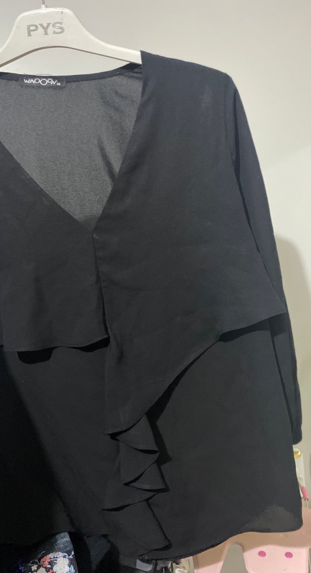 Bu siyah tunik, V yakalı ve uzun kolludur. Yumuşak sentetik kumaştan M beden 1 kez kullanışlı