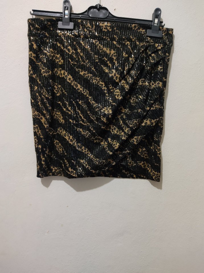 Yumuşak sentetik kumaştan, drapeli ve yılan desenli, dar kesim kısa siyah mini etek, sokak modası için uygundur.