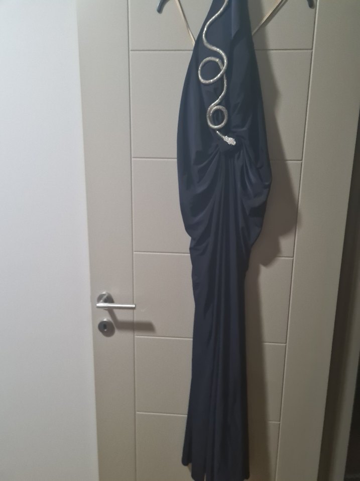 Drapeli ve yılan desenli siyah uzun elbise, halter yaka ve askılı kollara sahip. Gotik stil ve düğün için uygun.