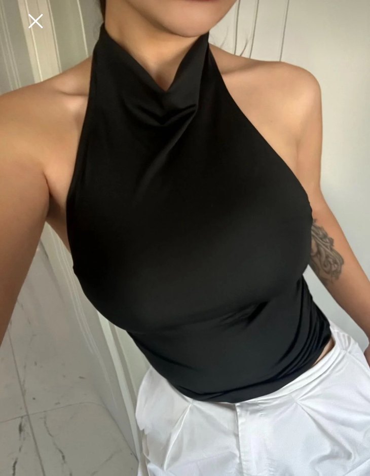 Siyah, drapeli ve yüksek yakalı bu atlet, ince ve ipeksi kumaştan yapılmıştır. Sokak modası ve athleisure için uygundur.