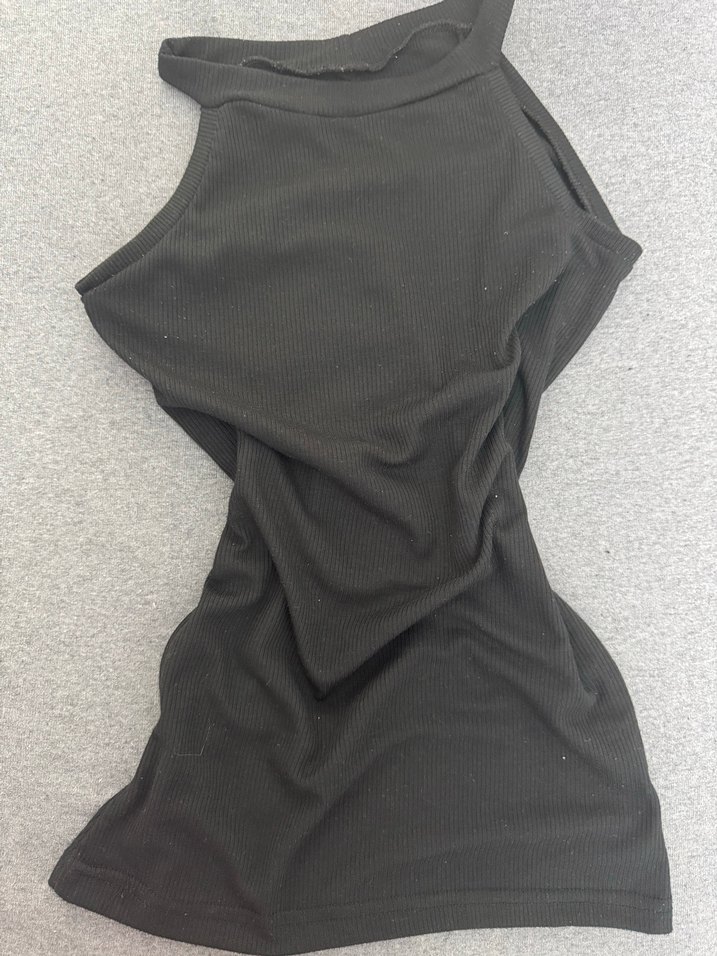Yüksek yakalı, kolsuz, drapeli ve midi boyda siyah kadın atlet. Yumuşak sentetik kumaştan üretilmiş, minimalist ve sokak tarzına uygun.