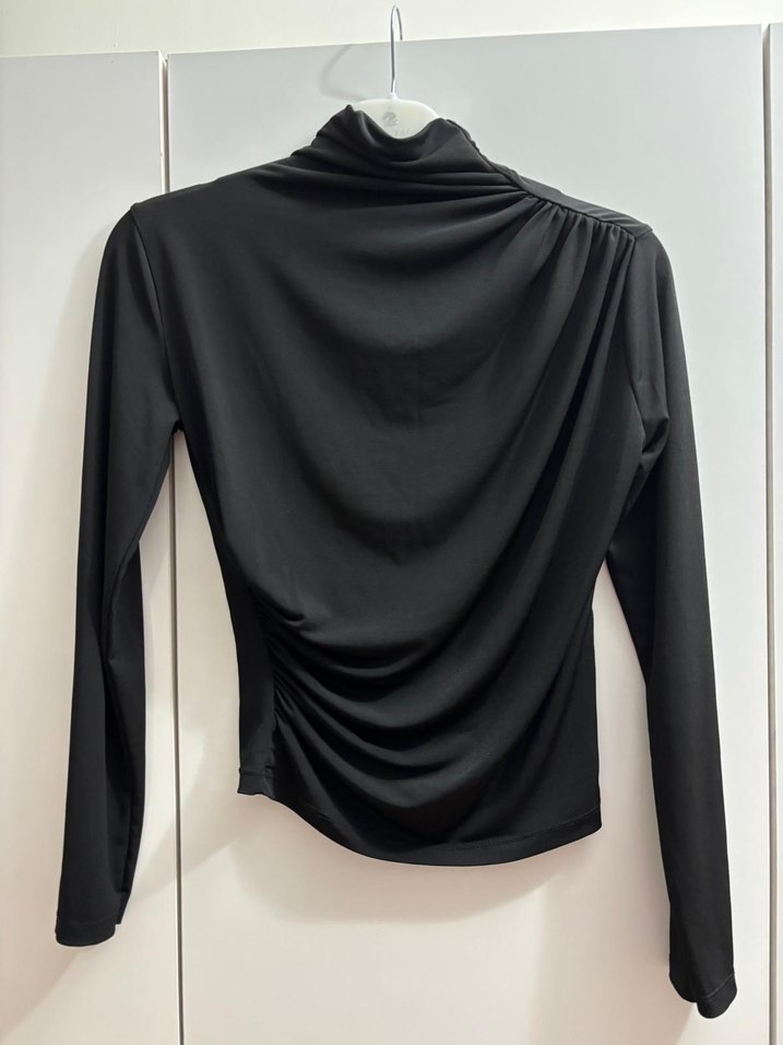 Drapeli tasarıma sahip, yüksek yakalı ve uzun kollu, siyah renkli, vücuda oturan kadın bluz. Ofis için minimalist goth tarzında şık bir parça.
