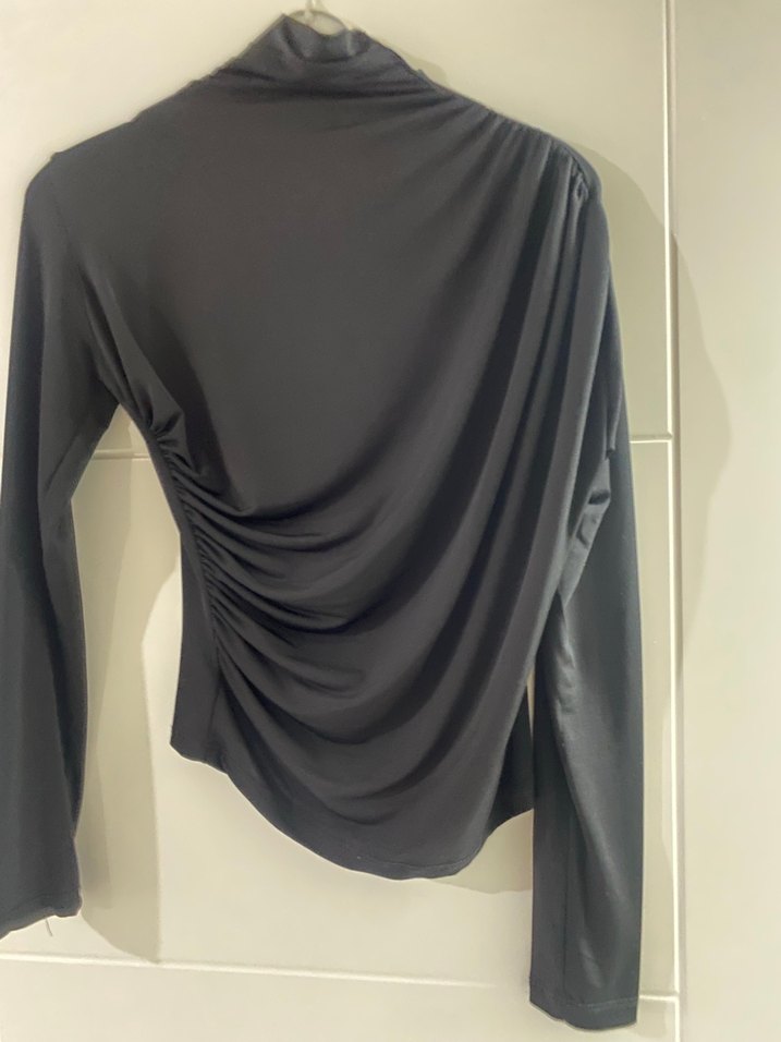 Drapeli, yüksek yakalı siyah kadın bluz, uzun kollu ve vücuda oturan kesime sahiptir. Pürüzsüz sentetik kumaştan yapılmış, ofis için uygundur.