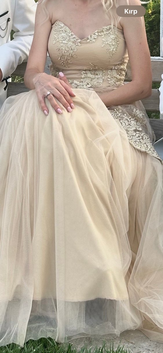 Bej renkli bu nişan elbisesi, straplez yakalı, vücuda oturan kesimi ve nakış detaylarıyla dikkat çeker. Uzun boyu ve drapeli, ince askılı kollara sahiptir, klasik zarafet ve bohem tarzı bir araya getirir.