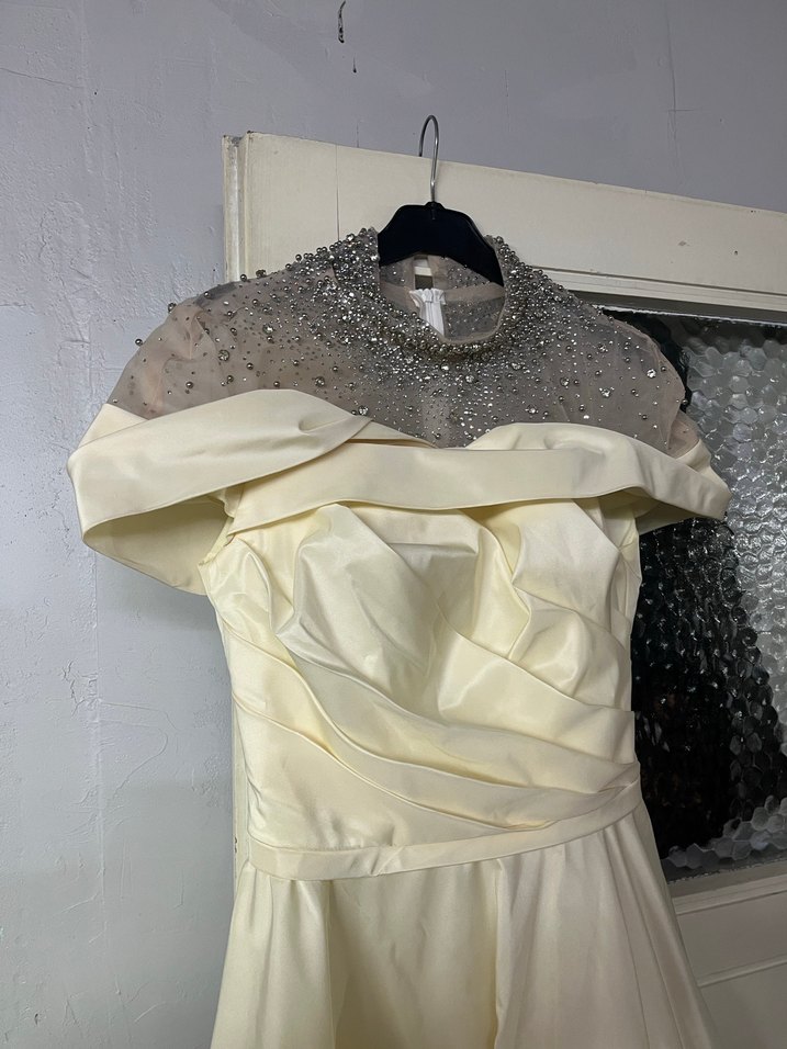 Bu beyaz abiye elbise straplez yakalı, drapeli ve vücuda oturan kesime sahiptir. Kısa kollu, işlemeli gri üst kısmı çağdaş ve avangart tarzları birleştirir.