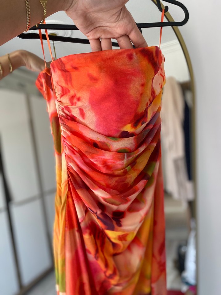 Yumuşak sentetik kumaştan, drapeli, straplez, hafif çok renkli uzun ve dar kesim midi elbise. Hiç kullanılmadı