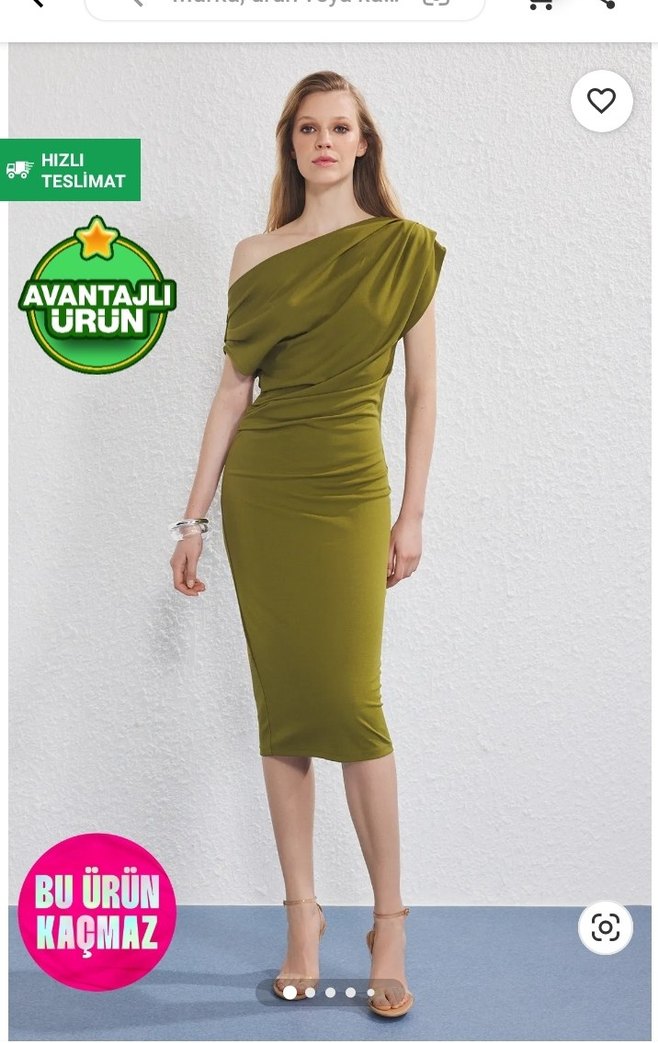 Parlak haki renkte, drapeli straplez yakalı ve midi boyda, vücuda oturan kalem elbise. Minimalist ve çağdaş tarzı sevenler için ideal sadece 2 saatligine nisanda giyildi yepyeni uygun tekliflere acigim