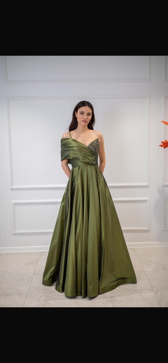 Khaki renkte, drapeli ve nakışlı uzun abiye elbise. Straplez yaka, regular fit ve parlak kumaş ile düğünler için uygun. 1 kez giyildi herhangi bir Defosu yoktur xs s bedene uygundur